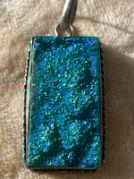 Druzy-Quarz Amulette mit roher, kristalliner Oberfläche in leuchtenden Türkis- und Grüntönen fängt das Licht ein und funkelt bei jeder Bewegung. Unikat. Gefasst in eine handgefertigte Lünette aus 925er Sterlingsilber mit feinen Details, kombiniert dieser Anhänger rustikalen Charme mit eleganter Brillanz.