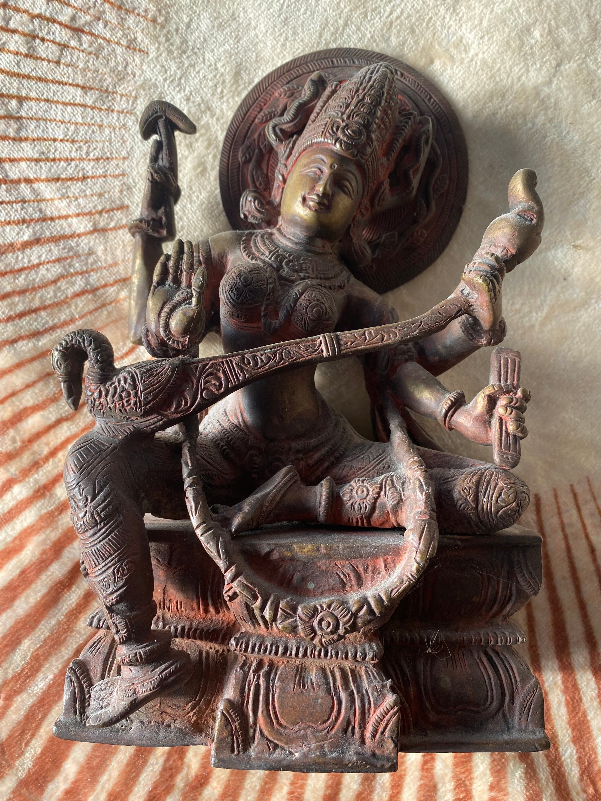 Die Skulptur stellt Saraswati dar, die hinduistische Göttin des Wissens, der Musik und der Künste, erkennbar an der Veena (Saiteninstrument) und dem Schwan. Sie wird oft mit vier Armen dargestellt. Ihre Herkunft liegt in der indischen Mythologie und stammt aus Südostasien.